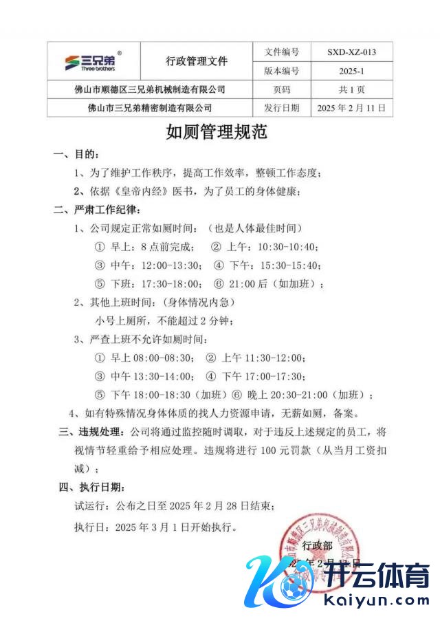 近日,一份名为《如厕管理法度》的文献在网高尚传,文献上表明的发布者为佛山市顺德区三昆季机械制造有限公司,发布时刻为 2 月 11 日。