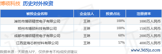 本站讯息,字据天眼查APP表现,博硕科技(300951.SZ)新增一说念对外投资事件,被投资公司为江西蓝海芯新材料有限公司,法定代表东说念主王琳,投资占比为57%。该公司从事化学原料和化学成品制造业,注册本钱为4000万东说念主民币。当今,博硕科技共存在对外投资4项,详见下表: