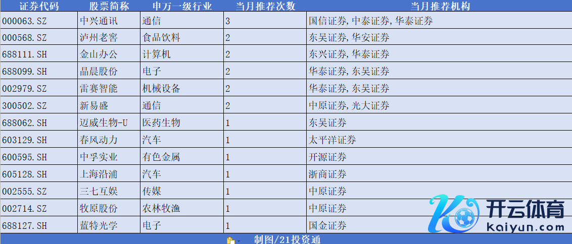 在统计的10余家券商9月金股中,中兴通讯被“点排行数”3次;泸州老窖、金山办公、晶晨股份、雷赛智能、新易盛也获2次推选。