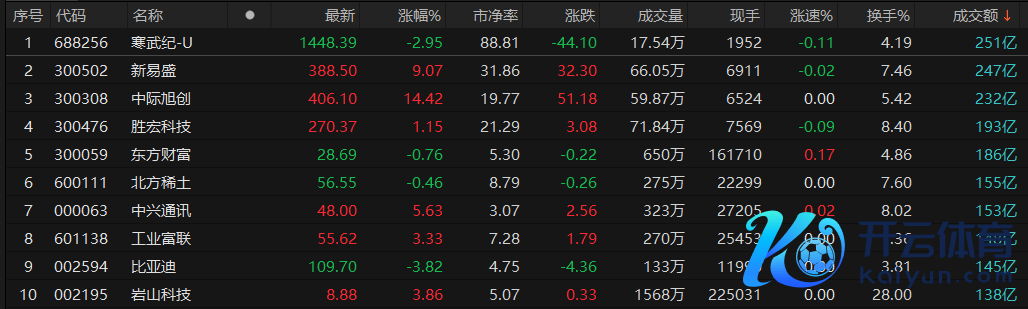 寒武纪-U成交额居首,为251亿元。自后是新易盛、中际旭创、胜宏科技、东方资产,成交额划分为247亿元、232亿元、193亿元、186亿元。